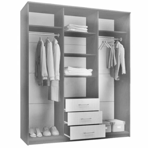 Шкаф-купе Маэстро содержит три выдвижных ящика, две секции со штангой для вешалок и секцию с полками.