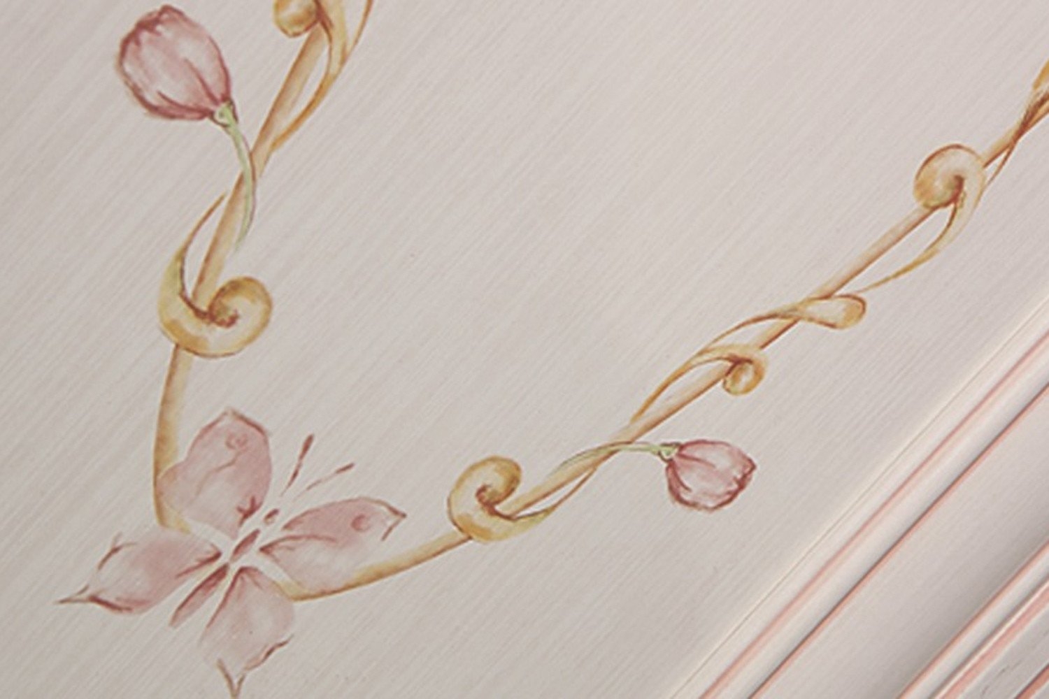 Алиса – мебель для девочек и девушек в классическом стиле, который поддержан светлым декором, цветочными рисунками и патиной на фасадах. При создании детской использовались приемы итальянского декорирования мебели. Мотивы классической росписи в сочетании с любимым мотивом детского рисунка – бабочки и цветы – создают ощущение юности и нежности. Использование декоративных элементов – корон и карнизов в наборе мебели не перегружают интерьер детской комнаты и при этом создают ощущение интерьера маленькой принцессы. Изящные ручки под золото со вставками молочно-белого цвета идеально сочетаются с кремово-белым декором и золотистой палитрой рисунков вензелей. При всей внешней легкости и утонченности мебель весьма практична в использовании, благодаря надежной фурнитуре. Все модули можно увидеть на странице серии.