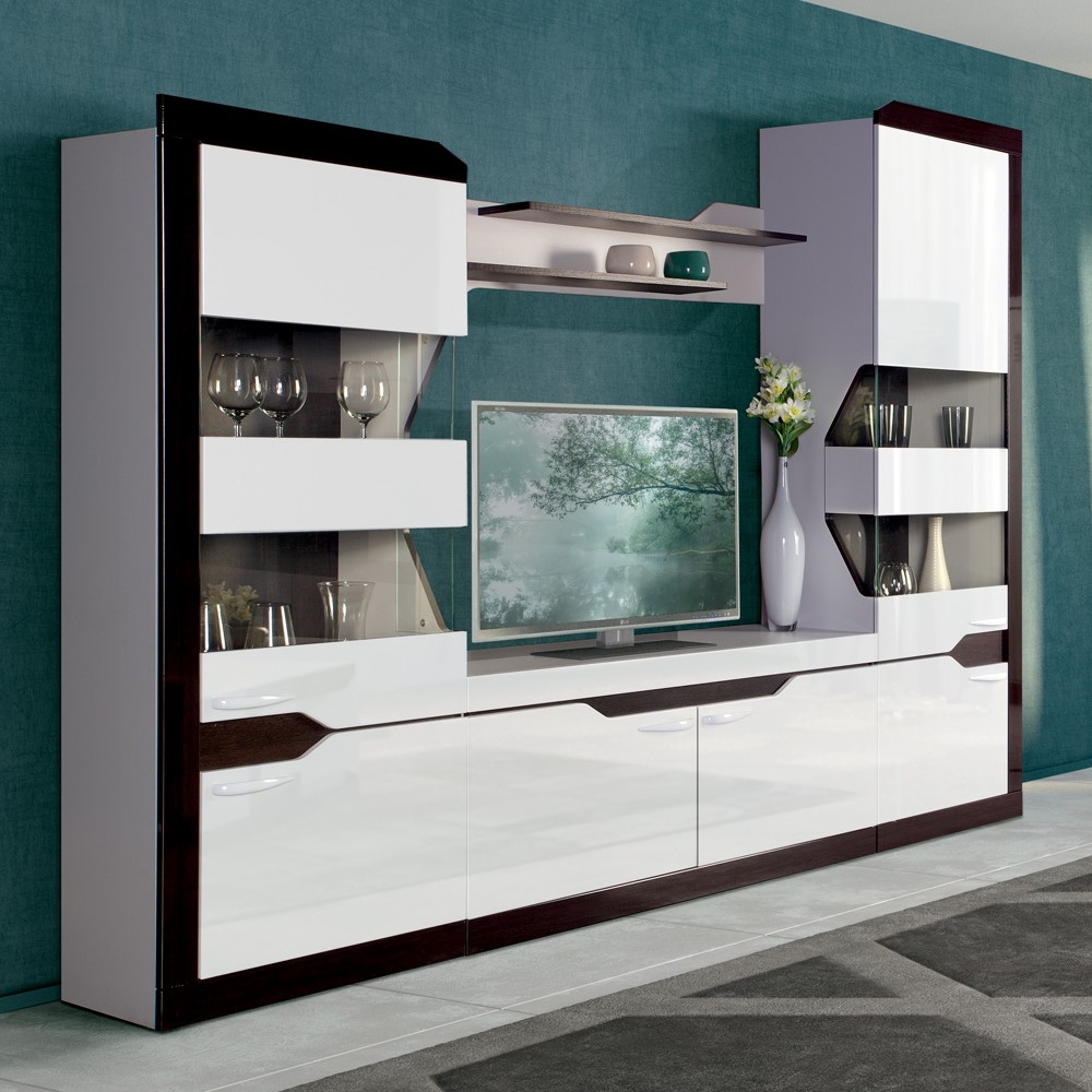 Благодаря сочетанию 2-х контрастных декоров – белого и венге с глянцевыми и матовыми поверхностями, а также оригинальному дизайну двухсторонних стеклянных витрин и декоративному приему стыковки модулей, Ронда выглядит эффектно и стильно. Завершают внешний облик белые глянцевые ручки итальянского производства. Мебель оснащена петлями с доводчиком, благодаря которым двери закрываются плавно и бесшумно, так что, можно не волноваться за стеклянные фасады. Модули комплекта: 302, 304, 303, 301. Эти и другие модули гостиной можно увидеть на странице серии.
