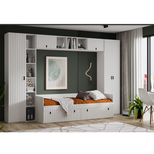 Детская коллекция мебели Тиффани представляет собой модульную систему, включающую все необходимые элементы: удобную кровать со спальным местом 900х2000, письменный стол с тремя полноценными ящиками для хранения, навесной шкаф и полки для книг, шкафы для одежды, белья и хранения различных предметов. Вы можете самостоятельно подобрать нужные модули и создать идеальную композицию, адаптированную к размерам и особенностям детской комнаты в соответствии с вашими потребностями и предпочтениями. Коллекция Тиффани одинаково хорошо будет выглядеть как в детской комнате, так и кабинете. Все модули можно увидеть на странице серии.