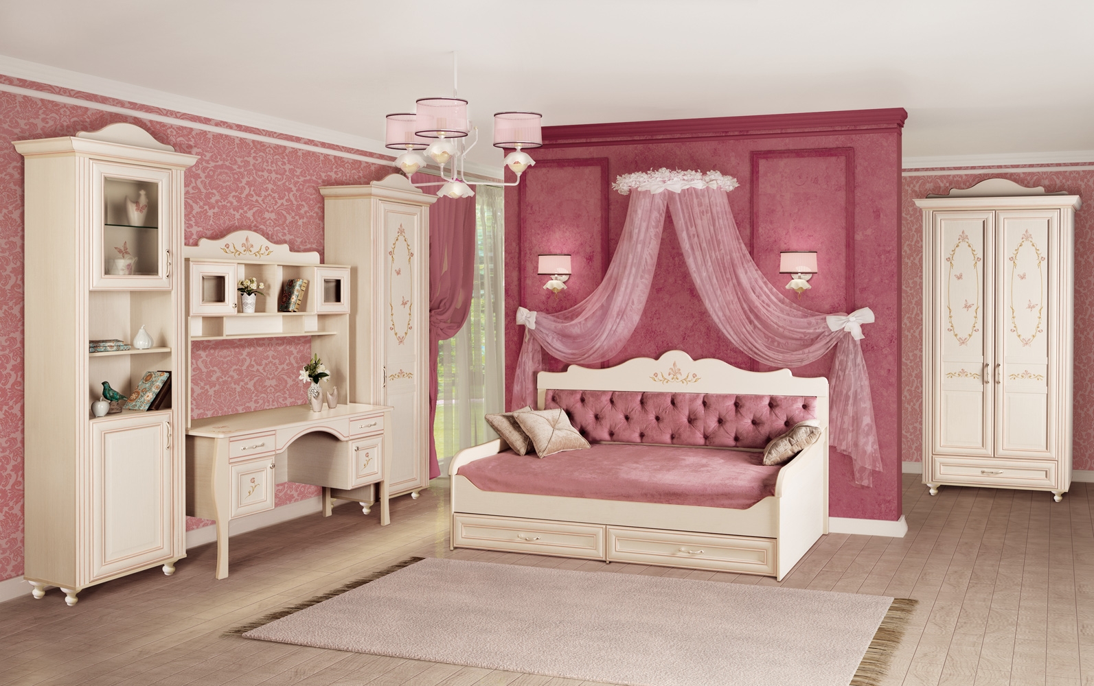 Алиса – мебель для девочек и девушек в классическом стиле, который поддержан светлым декором, цветочными рисунками и патиной на фасадах. При создании детской использовались приемы итальянского декорирования мебели. Мотивы классической росписи в сочетании с любимым мотивом детского рисунка – бабочки и цветы – создают ощущение юности и нежности. Использование декоративных элементов – корон и карнизов в наборе мебели не перегружают интерьер детской комнаты и при этом создают ощущение интерьера маленькой принцессы. Изящные ручки под золото со вставками молочно-белого цвета идеально сочетаются с кремово-белым декором и золотистой палитрой рисунков вензелей. При всей внешней легкости и утонченности мебель весьма практична в использовании, благодаря надежной фурнитуре. Все модули можно увидеть на странице серии. Дополнительно можно приобрести защитный бортик, покрывало и декоративные подушки этой серии.