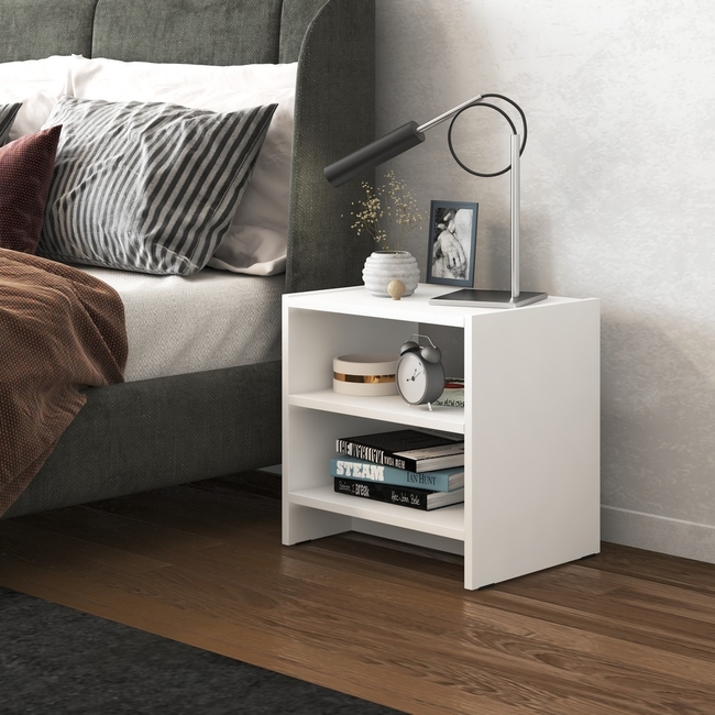 Тумба Лайт ТМ-001 хорошо подойдет к интерьеру спальни, оформленной в современном стиле. Двух небольших полок тумбы будет вполне достаточно для хранения вещей, а открытая ниша между нижней полкой и полом значительно облегчит процесс уборки.