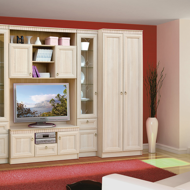 Гостиная Инна – это доступная классическая серия мебели для дома. В ней учтены все современные требования к качеству, внешнему виду и функциональности мебели. Узнаваемый облик гостиной создают рамочные фасады с объемными филенками и с гравированными стеклянными вставками, ручки с искусственным старением «под бронзу» и фрезерованные декоративные накладки. Широкий модульный ряд включает все необходимые предметы мебели для гостиной. Все модули можно увидеть на странице серии. Дополнительно можно приобрести полки из ЛДСП.